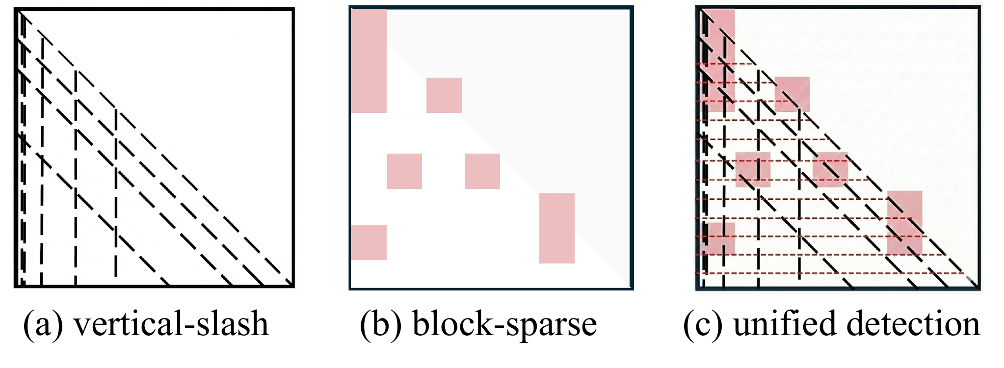 为了促进注意力图中稀疏模式的快速识别,我们对各种稀疏结构进行了定性分析。如图所示,一组均匀分布的查询足以同时解决垂直、斜线和块稀疏模式。我们将这种方法的成功归因于以下三个结构特性: