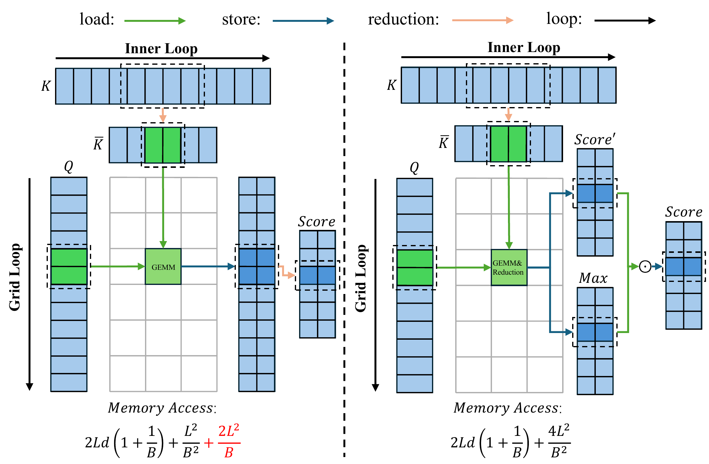 图 6:块评分方法比较。(左)具有显式注意力分数实现的standard kernel。(右)我们使用块级注意力近似的优化内核。与标准实现相比,我们提出的块级注意力分数近似通过绕过 $O(L^2/B)$ 的中间内存流量显著减少了内存访问开销。这里 $L$ 表示序列长度,$B$ 表示块大小,$d$ 表示token维度。