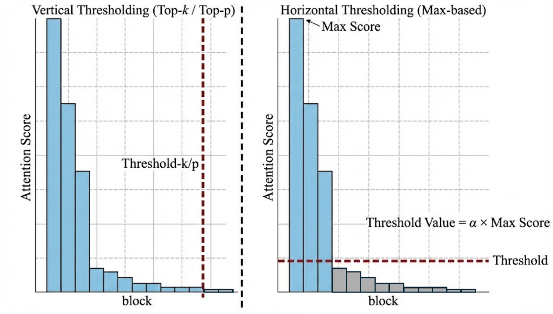 图 7:不同阈值化方法的比较。(左)Top-$k$和Top-$p$选择策略。(右)我们提出的基于最大值的阈值化。Top-$k$和Top-$p$方法往往容易受到长尾分布的影响,因为它们可能包含许多低显著性块只是为了满足固定的$k$或$p$约束。相比之下,我们的动态阈值化有效地减轻了长尾的影响,通过更精确地选择显著块来实现更高的稀疏性。